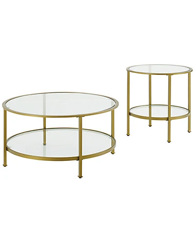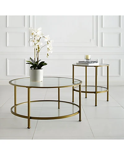 - Design details: Stylish and modern, the Aimee 2pc Coffee Table Set is an eye-catching addition to any home. With sleek steel frames, these tables can coordinate with a variety of decor. Each table has a tempered glass top and shelves, perfect for entertaining and display. Featuring a round side table and coffee table, the Aimee Coffee Table Set brings a cohesive and fashionable look to any living space. ; Art Deco inspired design; Soft gold finish; Frame is constructed of sturdy steel; Tempered glass tabletops; Tempered glass shelves; Round coffee table and side table frames; Upscale display and storage for any room; Pairs well with glam, modern farmhouse and traditional decor