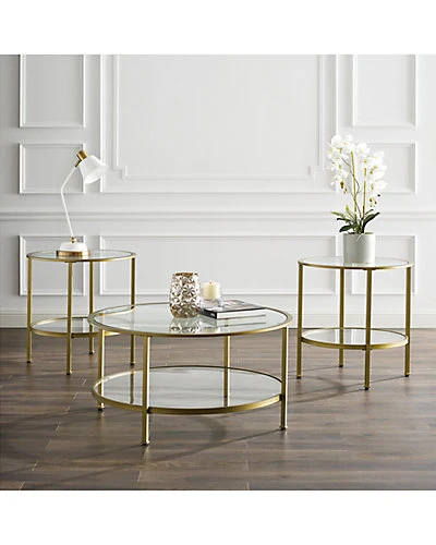 - Design details: Stylish and modern, the Aimee 3pc Coffee Table Set is an eye-catching addition to any home. With sleek steel frames, these tables can coordinate with a variety of decor. Each table has a tempered glass top and shelves, perfect for entertaining and display. Featuring two round side tables and a round coffee table, the Aimee Coffee Table Set brings a cohesive and fashionable look to any living space; Art Deco inspired design; Soft gold finish; Frame is constructed of sturdy steel; Tempered glass tabletops; Tempered glass shelves; Round coffee table and side table frames; Upscale display and storage for any room; Pairs well with glam, modern farmhouse and traditional decor