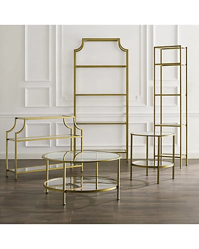 - Design details: Stylish and modern, the Aimee Console Table is an eye-catching addition to any home. A sturdy steel frame with pagoda-styling creates visual interest that can be paired with a variety of decor. The Aimee Console Tables open, tempered glass shelves are perfect for displaying mementos without overwhelming the room. ; Art Deco inspired design; Soft gold finish; Frame is constructed of sturdy steel; Two tempered glass shelves; Pagoda-styled frame; Upscale display and storage for any room; Pairs well with glam, modern farmhouse and traditional decor