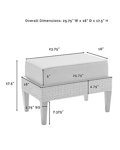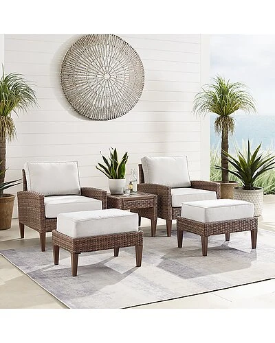 - Prop up your feet and chat away with the Capella 5pc Chair Set. Blending cool neutral tones with natural finishes, this set features all-weather resin wicker and hand-painted steel with a natural wood look. Beautiful quick-drying olefin fabric adds durability to the cushioned chairs and ottomans, while the slatted steel top of the side table is the perfect place to set your drink. With its stylish mix of elements, the Capella chair set adds a cool coastal vibe to your porch or patio.