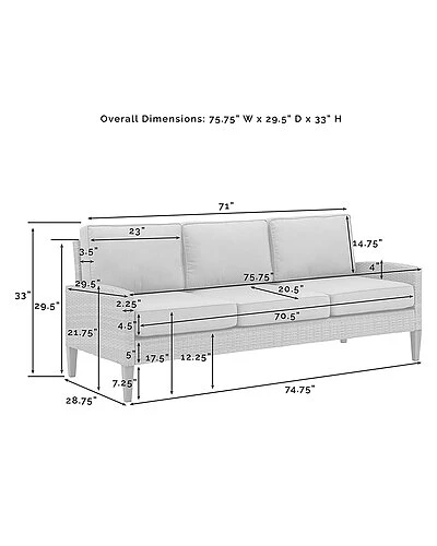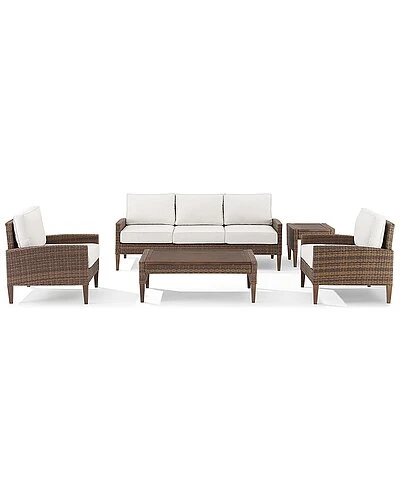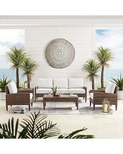 - Kick back and relax with the Capella 5pc Sofa Set. Blending cool neutral tones with natural finishes, this set features all-weather resin wicker and hand-painted steel with a natural wood look. Beautiful quick-drying olefin fabric adds durability to the cushioned sofa, while the slatted steel tops of the coffee and side tables are a perfect place to set your drink. With its stylish mix of elements, the Capella sofa set adds a cool coastal vibe to your patio or deck.