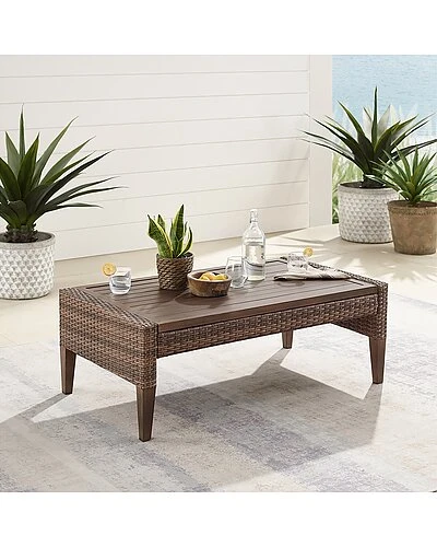 - A stylish mix of elements come together to create the Capella Outdoor Coffee Table. Featuring all-weather resin wicker and a slatted steel top hand-painted to look like wood, this coffee table is a unique and durable outdoor essential. Capellas blend of cool neutral tones and natural finishes adds coastal swagger to your outdoor space.