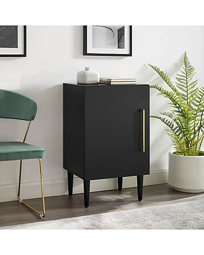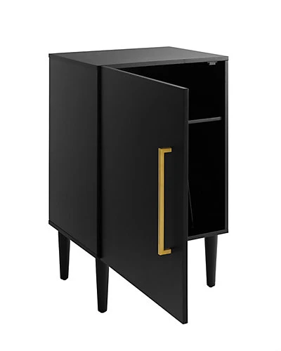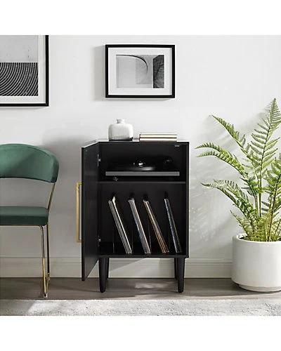 - Design details: The classic mid-century modern design of the Everett Record Player Stand is the perfect complement to your treasured turntable and precious vinyl. Sized perfectly to accommodate most component-style record players, this stand is as functional as it is stylish. Tucked behind the cabinet door are wire record dividers and an adjustable shelf for storing accessories or a second turntable, making the Everette Record Player Stand a must have for any vinyl enthusiast; Mid-century modern design; Matte black finish; Accessory shelf; Full overlay door; Wire slots for record storage; Holds approximately 75 albums; Tapered legs; Genuine metal hardware in a brushed gold finish