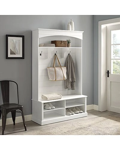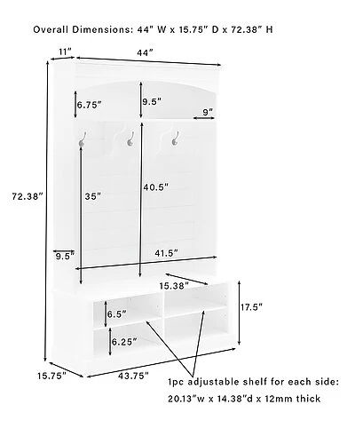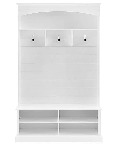 - With the popular look of modern farmhouse shiplap, the Bartlett Hall Tree is an on-trend take on home organization. Featuring a bench seat with shoe storage beneath, this hall tree is an ideal spot to slip off your shoes at the end of the day. Three extra-large, double-prong hooks look right at home under the arched top and stationary shelf. Topped with classic crown molding and backed with horizontal planking, the Bartlett Hall Tree offers beautiful storage for every entryway. Modern farmhouse design.White finish.Oversized genuine metal double prong hooks in a gunmetal finish.Beautiful arched top with crown molding.Shiplap paneling on the back.Four compartments in base sized for shoe storage.Two adjustable and removable shelves in base, each with a 15lb weight limit.Open stationary shelf with a 20lb weight limit.Large bench seating.Adjustable levelers on legs.Pairs well with traditional and coastal decor………
