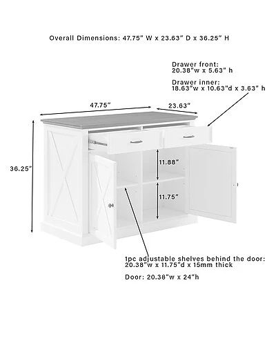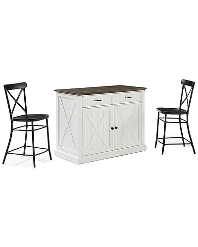 - Delivering modern farmhouse charm to your kitchen, the Clifton Kitchen Island with Camille Stools provides space for food prep and dining. An ideal focal point for your culinary space, the island features a large countertop, plus an overhang for the counter height stools. Each stool is constructed of solid steel with a classic x-back design. Featuring two large cabinets with adjustable shelving and two full-extension drawers, this island will keep your kitchen organized and clutter-free. Perfect as a breakfast bar, dining area, or for dishing up your favorite meal, the Clifton Kitchen Island with Camille Stools is a fabulous addition to your home. Modern farmhouse design.Distressed white finish on kitchen island.Faux wood countertop in a dark brown finish.Stools are constructed of solid steel.Black finish on stools.Genuine metal hardware in a gunmetal finish.Stools have an x-back design.Rustic x design on cabinet doors, sides, and back of the island.Cabinet doors on island have magnetic closures.The island has an adjustable shelf inside each cabinet with a 15lb weight limit per shelf.The island has two full-extension drawers on ball-bearing glides, each with a 15lb weight limit.The island’s countertop overhang provides space for the included counter height stools.Pairs well with traditional decor.Countertop weight limit is 100lbs.Kitchen Island Dimensions: 47.75″W x 23.63″D x 36.5″H / 157.30lbs.Stool Dimensions: 19.25″W x 19.25″D x 40.25″H / 13.75lbs….