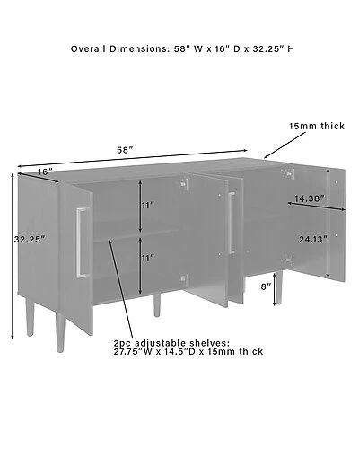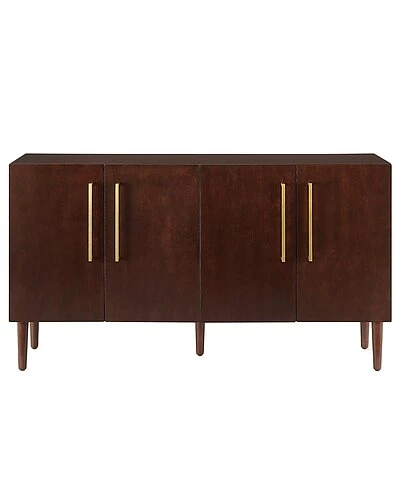 - Bring mid-century vibes to your dining room or kitchen with the Everett Sideboard. Perfect for tucking away dishes and barware, this sideboard provides two large cabinets with adjustable shelving. Perched atop tapered legs and showcasing classic bar hardware, the Everett Sideboard will add polish and style to any room. Mid-century modern design.Mahogany finish.Genuine metal hardware in a brushed gold finish.Two large cabinets with double doors and magnetic closures.Adjustable and removable shelf inside cabinet with a 15lb weight limit.Tapered legs.Adjustable levelers on legs.Pairs well with modern, farmhouse, and rustic decor.Sideboard top weight limit is 100lbs………..