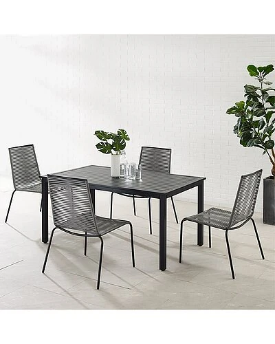 - Featuring four armless chairs and a rectangular dining table, the Fenton 5pc Dining Set offers sleek simplicity for outdoor dining. The chairs feature flat wicker with a rope look and are stackable for easy storage. Offering ample eating space, the classic slatted dining table is made from durable powder-coated steel. Add the Fenton dining set to your patio or deck to enjoy a meal in the great outdoors. Modern design .UV resistant all-weather flat resin wicker on chairs.Chairs have weather-resistant powder-coated steel frames.Table is constructed of sturdy weather-resistant steel.Handwoven gray resin wicker on chairs.Matte black finish on table and chair legs.Handwoven wicker on chairs has the look of rope.Chairs are stackable for easy storage.Standard umbrella hole in table measures 1.97″ in diameter.Umbrella hole cover sits flush with the tabletop.Table weight limit is 100lbs.Chair Dimensions: 23.75″W x 24″D x 35.5″H / 7.7lbs.Table Dimensions: 60″W x 37″D x 28.5″H / 49.5lbs…….