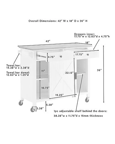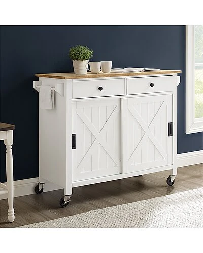- The Laurel Kitchen Island/Cart adds farmhouse charm to kitchen storage. Full-extension drawers offer space to tuck small items, while the lower cabinet showcases a sliding barn door motif. Featuring optional casters for mobility, the Laurel Kitchen Island/Cart brings flexible organization and counter space wherever it goes. Modern farmhouse design.White finish with a natural finished solid wood top.Genuine metal hardware in a black finish.The sliding cabinets doors have a rustic x design over beadboard style planks.One adjustable and removable shelf inside each cabinet with a 15lb weight limit per shelf.Two full-extension drawers on ball-bearing glides, each with a 15lb weight limit.Two easily accessible towel bars.Includes four casters with two that lock.Pairs well with traditional decor.Countertop weight limit is 100lbs……….