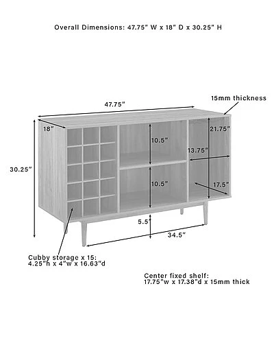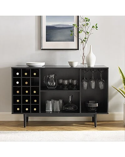 - Simple and stunning, the Liam Wine Storage Sideboard has a mid-century style perfect for the modern wine lover. Perched atop classic tapered legs, this sideboard features three open compartments that can accommodate dishes and decor, plus a 15-bottle wine rack and slots for wine glasses. Add the Liam Sideboard to your dining or family room for wine storage and display space. Mid-century modern design.Black finish.Tapered legs.Adjustable levelers on legs.Three open storage compartments each with a weight limit of 20lbs.15 compartment wine storage.Metal under-shelf stemware rack.Pairs well with industrial, rustic and modern decor.Sideboard top weight limit is 100lbs………..