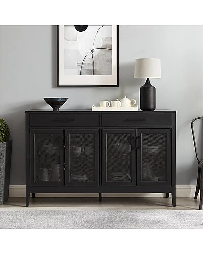 - Ready to blend with a variety of home styles, the Milo Sideboard has a simple design with unique details. The large cabinet doors feature beautiful poly-rattan mesh panels, which conceal adjustable and removable shelves. Whether used as a traditional sideboard, credenza, or TV stand, the Milo Sideboard is the perfect multipurpose furniture piece. Modern design.Black finish.Genuine metal hardware in a black finish.Two large cabinets with double doors and magnetic closures.Cabinet doors have poly-rattan mesh panels.Adjustable shelf inside each cabinet with a 15lb weight limit per shelf.Two full-extension drawers on ball-bearing glides, each with a 15lb weight limit.Two perforated cable management holes.Can be used as a traditional sideboard or as a TV stand.Fits most TV’s up to 65″.Pairs well with modern farmhouse, traditional, and boho decor.Sideboard top has a weight limit of 100lbs……..