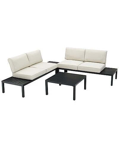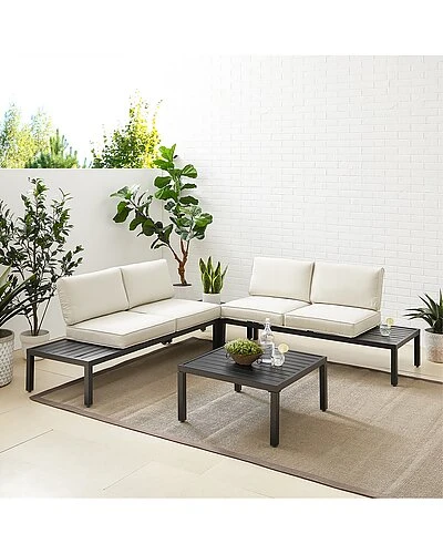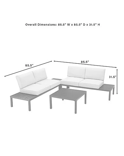 - Add a relaxing spot to unwind outside with the Piermont 4pc Sectional Set. Decidedly modern, this set has a low-profile silhouette for lounging in stylish repose. Built-in side tables on each loveseat offer a convenient spot to rest your drink, while the corner side table eliminates the often unused corner seat of the sectional. Add in the matching coffee table and the Piermont 4pc Loveseat Set will be the best seat out of the house. Modern design.Weather-resistant powder-coated steel frame.Matte black finish.UV and rust resistant.Creme cushion covers.High-performance solution-dyed polyester cushion covers resist mildew, sun fade, and abrasion.Moisture-resistant high grade cushion cores.Low-profile silhouette.Tables have slatted tops.Built-in side tables on the loveseats.Seating for up to four.Modular design allows for a variety of seating configurations.Table weight limits are 25lbs.Loveseat Dimensions – 62.5″W x 24.5″D x 31.5″H.Side Table Dimensions – 23″W x 23″D x 12.5″H.Coffee Table Dimensions – 28.5″W x 28.5″D x 14.5″H