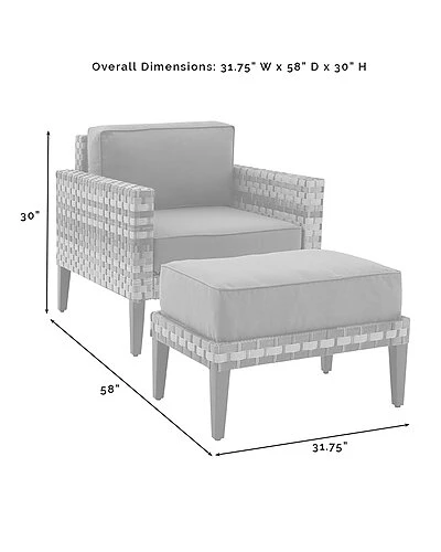 - Combining a modern silhouette and classic wicker, the Prescott 2pc Armchair Set is the luxurious seating you need for your outdoor retreat. Resistant to the whims of mother nature, the armchair and ottoman feature all-weather resin wicker handwoven over powder-coated steel frames. The wide wicker is beautifully weathered and has the textured feel of natural fiber. Topped with deep moisture-resistant cushions, the Prescott Armchair Set will be your favorite spot to relax in the sun. Modern design .UV resistant all-weather flat wide resin wicker.Weather-resistant powder-coated steel frame.Handwoven multi-tone brown resin wicker with a weathered natural texture.Due to the multi-tone wicker, color variation among pieces should be expected, and enhances the character of the product.Taupe cushion covers.Quick-drying olefin fabric cushion covers resist mildew and sun fade.Moisture-resistant high grade cushion cores.Removable cushion covers are machine washable.Steel tapered legs in a dark brown finish.Adjustable levelers on legs.Ottoman cushion sits in a recessed section of the ottoman to prevent slippage.Seating for up to two.Armchair Dimensions: 31.75″W x 32.5″D x 30″H / 32.56lbs.Ottoman Dimensions: 26.5″W x 18″D x 18″H / 14.08lbs…..