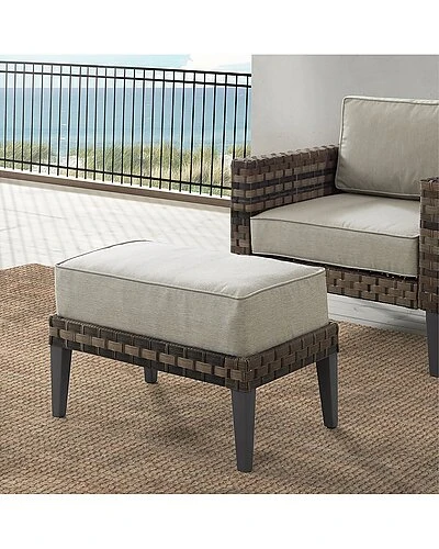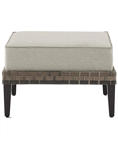 - Kick up your feet and catch some sun with the Prescott Ottoman. Wrapped in all-weather wicker, this ottoman is resistant to the whims of mother nature. The wide wicker is beautifully weathered and has the textured feel of natural fiber. With its thick, moisture-resistant cushion, the Prescott Ottoman can double as extra seating for your outdoor retreat. Modern design .UV resistant all-weather flat wide resin wicker.Weather-resistant powder-coated steel frame.Handwoven multi-tone brown resin wicker with a weathered natural texture.Due to the multi-tone wicker, color variation among pieces should be expected, and enhances the character of the product.Taupe cushion covers.Quick-drying olefin fabric cushion covers resist mildew and sun fade.Moisture-resistant high grade cushion cores.Removable cushion covers are machine washable.Cushion sits in a recessed section of the ottoman to prevent slippage.Steel tapered legs in a dark brown finish.Adjustable levelers on legs……..