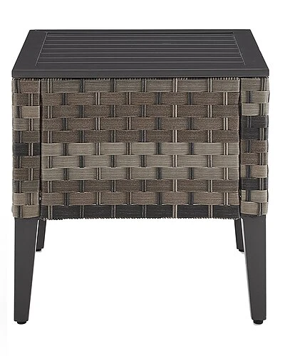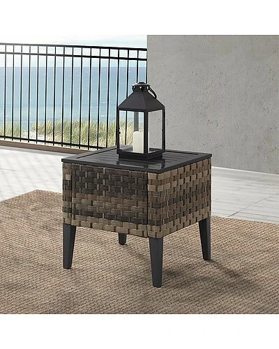 - Add table space to your outdoor retreat with the Prescott Side Table. Offering a mix of modern metal and classic wicker, the table features all-weather resin wicker with a steel top perfect for resting a cool drink. The wide wicker is beautifully weathered and has the textured feel of natural fiber. Create a convenient space for entertaining or relaxing outside with the Prescott Side Table. Modern design .UV resistant all-weather flat wide resin wicker.Weather-resistant powder-coated steel frame.Handwoven multi-tone brown resin wicker with a weathered natural texture.Due to the multi-tone wicker, color variation among pieces should be expected, and enhances the character of the product.Slatted steel tabletop in a dark brown finish.Steel tapered legs in a dark brown finish.Adjustable levelers on feet.Table weight limit is 100lbs………..