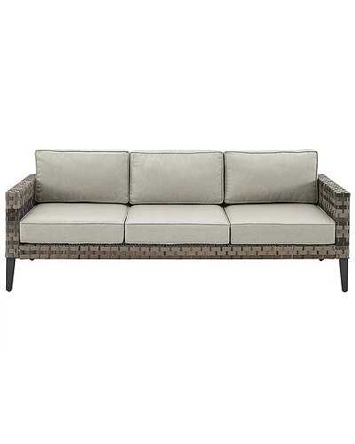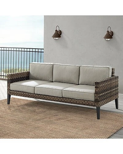 - Combining a modern silhouette and classic wicker, the Prescott Sofa is the luxurious seating you need for your outdoor retreat. Covered in rich, all-weather resin wicker, this sofa is resistant to the whims of mother nature. The wide wicker is beautifully weathered and has the textured feel of natural fiber. Topped with deep moisture-resistant cushions, the Prescott Sofa will be your favorite spot to relax in the sun or gather with friends. Modern design .UV resistant all-weather flat wide resin wicker.Weather-resistant powder-coated steel frame.Handwoven multi-tone brown resin wicker with a weathered natural texture.Due to the multi-tone wicker, color variation among pieces should be expected, and enhances the character of the product.Taupe cushion covers.Quick-drying olefin fabric cushion covers resist mildew and sun fade.Moisture-resistant high grade cushion cores.Removable cushion covers are machine washable.Steel tapered legs in a dark brown finish.Adjustable levelers on legs.Seating for up to three……..