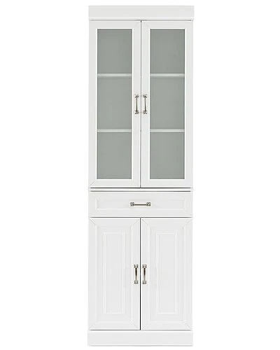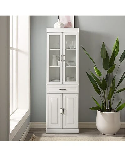 - The Stanton Glass Door Pantry combines classic styling with the versatility of modular design. Featuring adjustable shelves in the lower and upper cabinets, this pantry is great for home organization. Similar to a traditional china hutch, the glass doors of the upper cabinet allow you to show off your favorite dishes, while the lower cabinets panel doors keep everyday items out of sight. The modularity of the Stanton pantry allows it to mix with other items in the collection for customizable storage. Traditional design.White finish.Genuine metal hardware in a brushed nickel finish.Two large cabinets with double doors, magnetic closures, and concealed hinges.Two adjustable and removable shelves in upper cabinet with a 15lb weight limit.Adjustable shelf in lower cabinet with a 15lb weight limit.Full-extension storage drawer on ball-bearing glides with a 15lb weight limit.Upper cabinet has tempered glass doors.Recessed paneling on lower cabinet doors and drawer front.Modular design allows multiple units to be paired together or with other items in the collection.Pairs well with modern farmhouse decor………