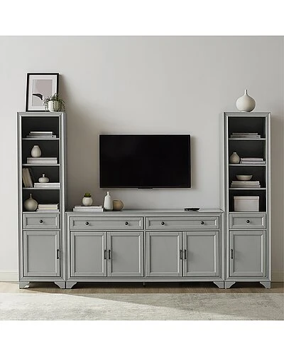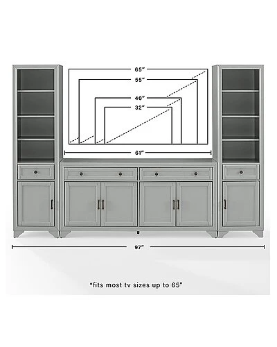 - Whether you love a traditional look or a modern farmhouse vibe, the Tara 3pc Entertainment Set is a stylish take on a classic entertainment center. The sideboard features two wide full-extension drawers and two large cabinets with adjustable shelves. Each bookcase has a full-extension drawer and three open adjustable shelves. The Tara 3pc Entertainment Set is a great storage option for framing large TVs up to 65″. Modern farmhouse design.Distressed gray finish.Genuine metal hardware in a distressed brass finish.The sideboard has two large cabinets with double doors and magnetic closures.The sideboard has two full-extension drawers on ball-bearing glides, each with a 15lb weight limit.Each bookcase features a full-extension storage drawer on ball-bearing glides with a weight limit of 15lbs.Each bookcase has three adjustable/removable shelves, each with a 15lb weight limit.Each bookcase has a cabinet door with magnetic closures which can be installed on the left or right of the bookcase.Each cabinet has an adjustable and removable shelf with a 15lb weight limit per shelf.Fits most TV’s up to 65″.All pieces are modular to maximize space and flexibility.Pairs well with traditional decor.Sideboard top weight limit is 100lbs.Bookcase Dimensions: 18″W x 15″D x 67.63″H / 72.6lbs.Sideboard Dimensions: 61″W x 15″D x 29.63″H / 97.9lbs…..