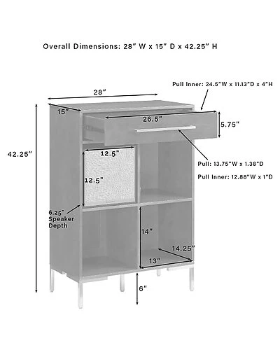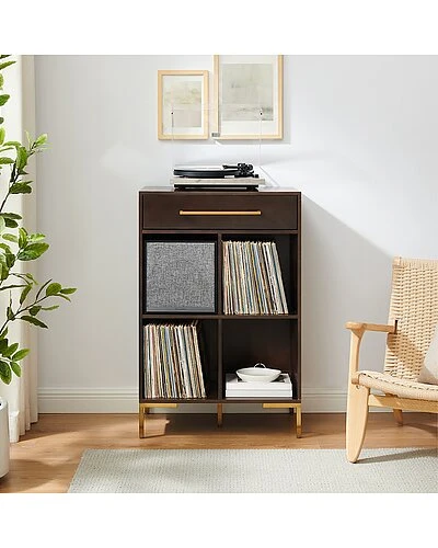 - Incorporate streamlined modern storage into your home with the Juno Record Storage Cube Bookcase with Speaker. Featuring a sleek silhouette and stylish hardware, this bookcase has four cube shelves sized perfectly for standard records as well as books or decor. The drawer offers storage for electronic accessories and cleaning supplies, while the top of the bookcase accommodates a variety of standard record players. Ideal for every music lover, this bookcase includes a 40W output Bluetooth speaker that blends seamlessly into any of the cube shelves. Create a dedicated listening room anywhere in your home with the Juno Record Storage Cube Bookcase with Speaker.