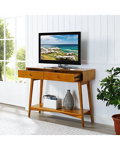 - Design details: Add some swanky style to your home with the Landon Console Table. This mid-century inspired design is accented with genuine metal hardware and the solid hardwood is finished in warm acorn. This piece is perfect for storing away odds and ends within the two full-extension, pullout drawers, and for displaying collectibles and decor on the planked shelf. This table is a stylish addition to your entryway, living room, or bedroom; Mid Century Modern Design; Acorn Finish; Two Pullout Drawers for Storage; Genuine Metal Hardware; Full Extension Glides; Bottom shelf for storage and decor; Black Adjustable levelers; Light Assembly Required; Light Assembly Required