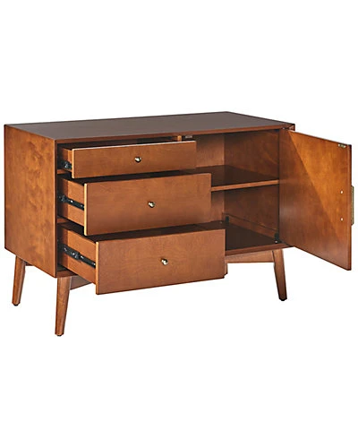 - Design details: Taking cues from mid-century modern design, the Landon Media Console can serve as an innovative media cabinet or a sleek accent chest. Along with the spacious cabinet and adjustable shelves, the three side drawers roll out on full extension glides, giving easy access to every corner. With slender tapered legs and modern lines, the Landon Media Console brings elegant simplicity into any home.