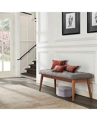 - Design details: The Landon Bench is mid-century modern versatility at its finest. This bench could be used at the dining room table, the end of your bed, or in your entryway. The linen gray button-tufted upholstery is comfortable, while the vibrant white finished legs are sturdy and include an adjustable leveler. The Landon Bench is useful, without sacrificing style; Mid Century Modern Design; Tufted Upholstered Seat Cushion; Acorn Finish; Vibrant white finish; Black Adjustable levelers; Landon Collection; Light Assembly Required