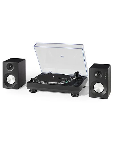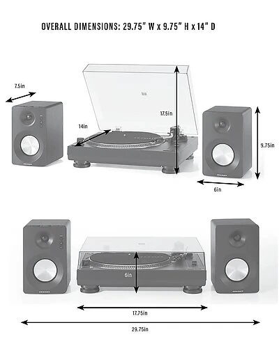 - box includes: turntable, turntable lid, turntable platter, turntable slip mat, headshell, 45 rpm adapter, tonearm counterweight, speakers (left/right), ac power cord, rca to 3.5mm cable, speaker wire