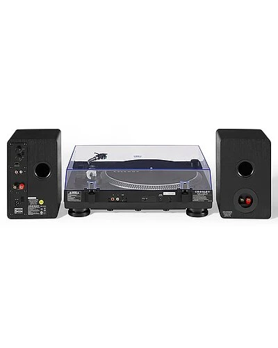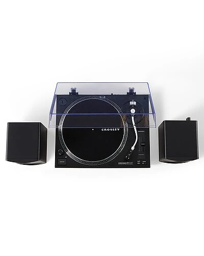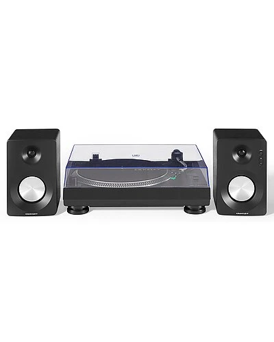 - Design details: ready to get more out of your vinyl? take a turn with the new crosley c100bt, the perfect turntable for the daily vinyl listener whos ready to upgrade their listening experience. aspiring audiophiles will immediately notice the outstanding clarity of the high-performance audio-technica at95e cartridge. the adjustable counterweight and smooth s-shaped curve of the aluminum tonearm will get you in the groove with ease, and the low-vibration synchronous motor and vibration control feet ensure smooth play every single time. keep your records pristine and dust-free with the clear plastic cover (and its easily removable if thats your thing). connect to the included 30-watt stereo powered s100 speakers or to your favorite wireless speaker with the bluetooth out function and prepare to be blown away by the sound of the c100bt.