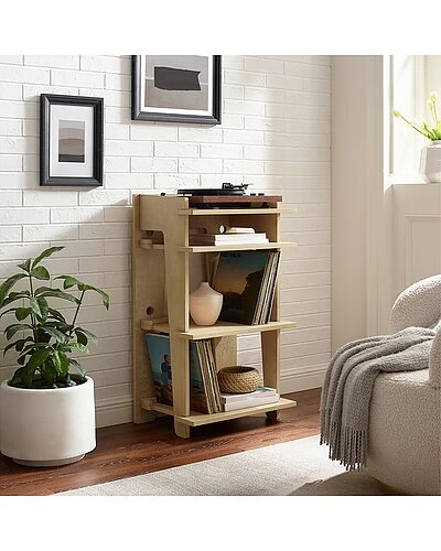 - Design details: the soho by crosley is the music lover’s ultimate turntable stand. the top shelf fits most component-style turntables and features two cable management holes to keep your set up tidy. the second shelf is perfect for your accessories: preamp, mini amp, cleaning supplies, etc. and features two more cable management holes. the bottom two shelves can hold up to 100 records each and feature bumpers in the back to ensure that the records sit uniform and are easily accessible. because details matter, there are two grooves to display the jacket of the record thats spinning and space under the bottom shelf to keep your records away from the true enemy: dirt and dust. were confident that the soho turntable stand is the most thoughtful and affordable solution on the market.