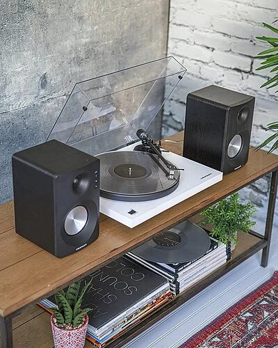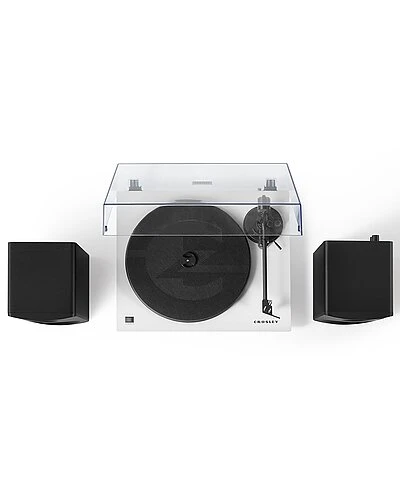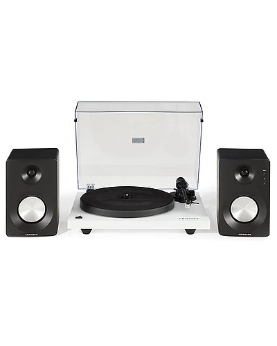 - Design details: the crosley c6 is a fully manual two-speed turntable created to give music fans a true analog experience. an audio-grade mdf plinth is wrapped in veneer to suit your style, and since weight helps keep vibration at bay, a heavy steel platter provides a solid seat for your vinyl during play. housed underneath the platter, a low vibration synchronous motor connected via belt spins records at both 33 1/3 and 45 rpms – simply move the belt from one groove to another to change speeds. dial in the tracking force with the adjustable tonearm counterweight and then use the cueing lever to gently drop the needle on the record to fill the room with the warm sound of vinyl. the c6 comes with a moving magnet cartridge preinstalled, but uses a standard mount so you can upgrade as your vinyl collection grows. connect the included s100 speakers, which include a built-in 30 watt power amp and bluetooth connectivity, and crank it up!