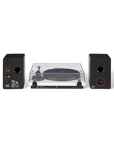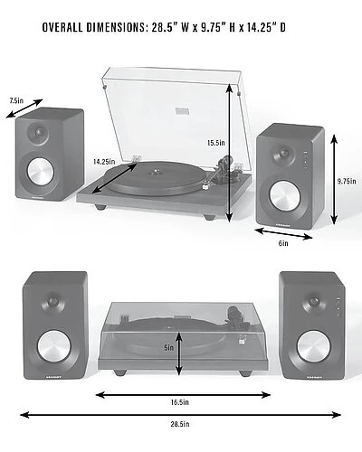 - box includes: turntable, turntable lid, turntable slip mat, turntable platter, tonearm counterweight, cartridge alignment protractor, power adaptor, speakers, ac power cord, rca to 3.5mm cable, speaker wire