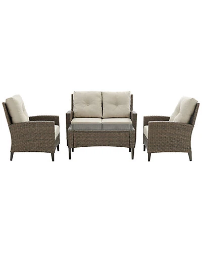 - Great for entertaining or lounging with friends, the Rockport 4pc Conversation Set features two chairs, a loveseat, and coffee table made of all-weather resin wicker over powder-coated steel frames. The chairs and loveseat offer high backs with plush cushions covered in olefin fabric for durable comfort. Topped with tempered glass, the coffee table adds just the right amount of table space for resting a cool drink. All perched atop steel tapered legs painted to look like real wood, the Rockport 4pc Conversation Set brings classic style to your outdoor oasis without sacrificing durability.