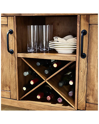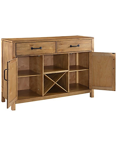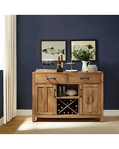 - Design details: Modern simplicity meets rustic charm with the Roots Sideboard. A hand finishing technique provides a unique distressed look to the sideboard while the metal hardware adds an element of industrial chic. With two large drawers, two cabinets, an open shelf and wine storage, this simple design sacrifices no amount of function; Modern, Industrial Farmhouse Design; Natural wood finish; Two large storage drawers; Two Cabinets with adjustable shelving and planked panel doors; Open wine storage for up to 12 bottles; Removable inserts for wine storage ; Industrial metal hardware; Sideboard easily converts to an entertainment console with perforated holes on the back for cord management